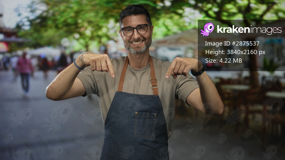 Man points both index fingers to apron while smiling on street terrace restaurant; welcoming small business.