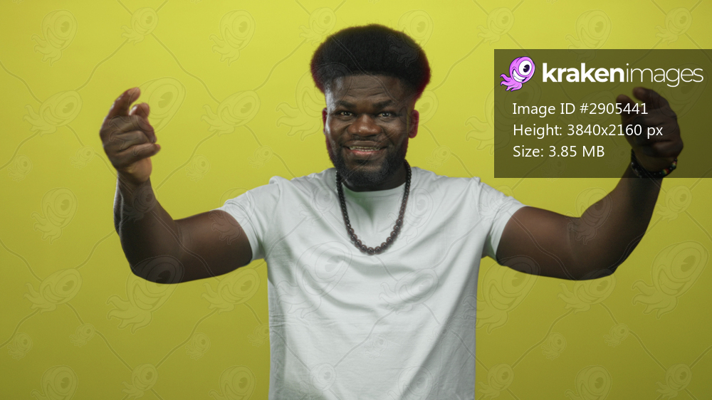 Man points both index fingers to his chest in studio with yellow wall and beaded necklace visible; self confidence.