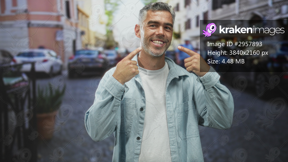 Man points both index fingers to his smile while wearing a light denim jacket and white tshirt on a cobbled city street lined with parked cars; confidence ease connection. - Kraken Images