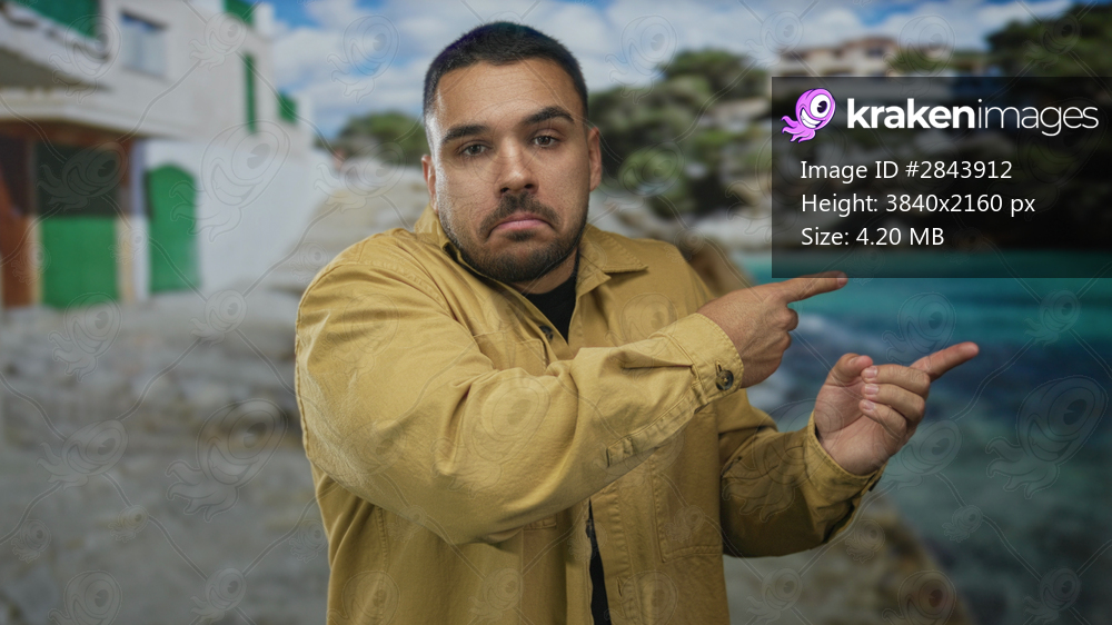 Man points both index fingers toward turquoise water beside a white building on sandy shore under bright sky; doubt.