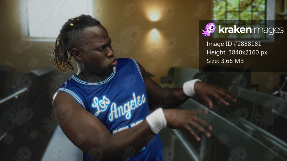 Man points finger across church pew showing bare arm and blue los angeles jersey inside a small catholic church with stained glass windows; determination. - Kraken Images
