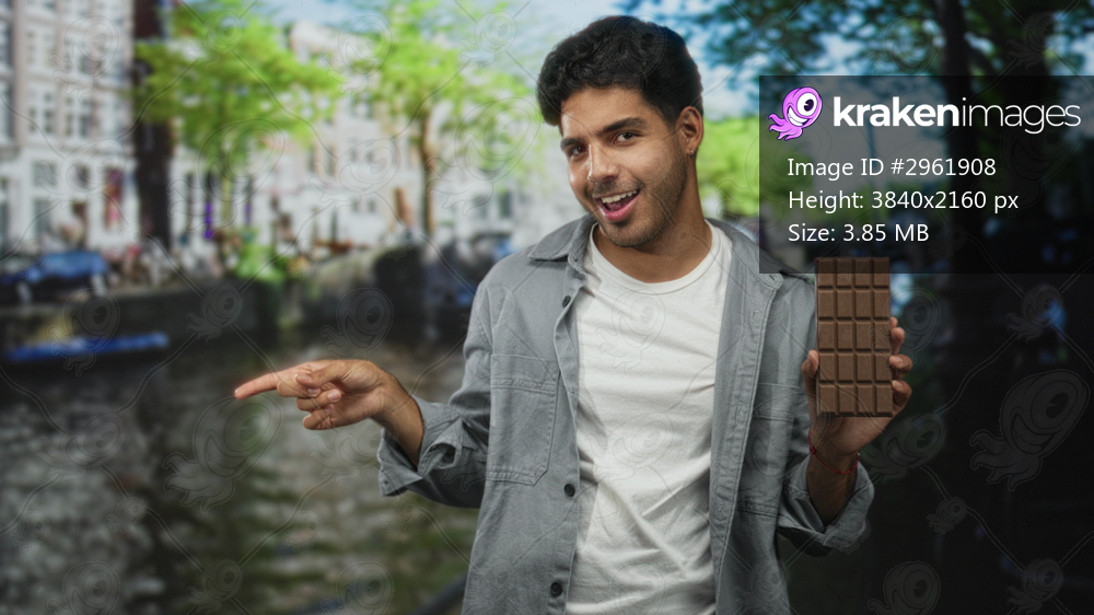 Man points finger at a large chocolate bar while holding it in his right hand on a street canal scene, smiling broadly; playful joy.