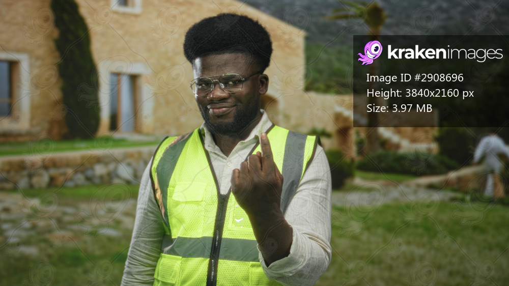 Man points finger at camera by building entrance wearing reflective yellow vest and glasses, showing beard and hand gesture; confidence safety guidance. - Kraken Images