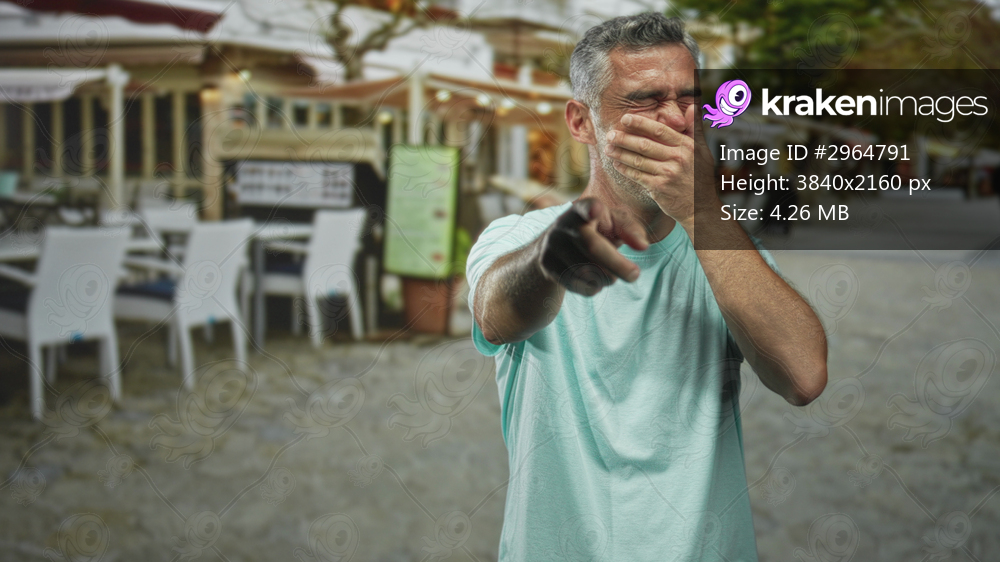 Man points finger at camera and covers mouth with hand in a street cafe, mint shirt and grey hair; playful amusement.