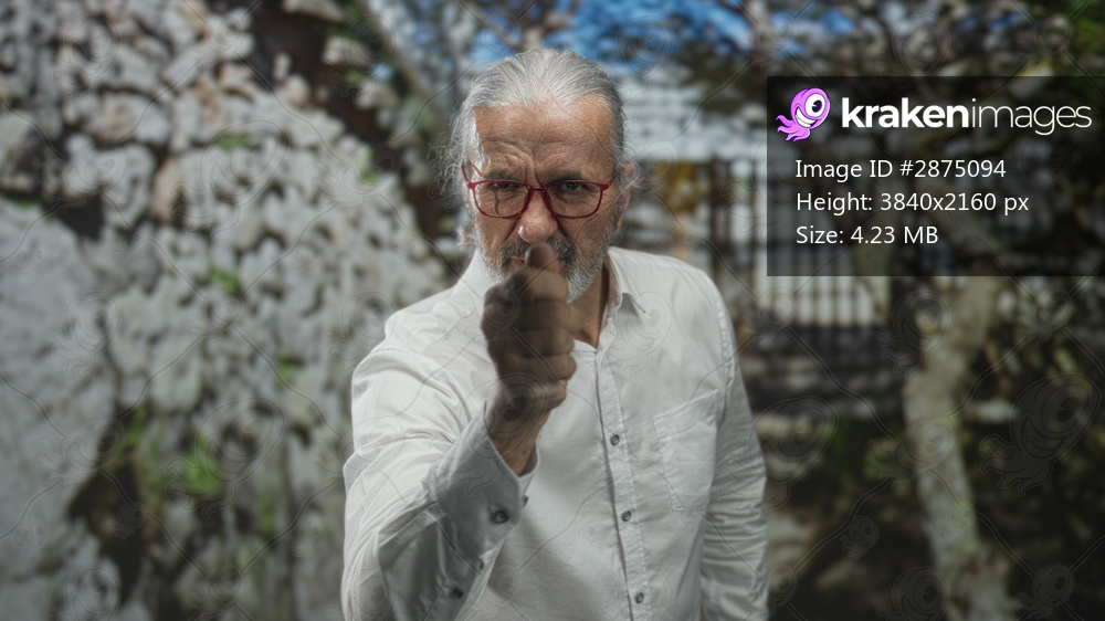 Man points finger at camera, hand extended toward viewer in front of building entrance; anger blame.