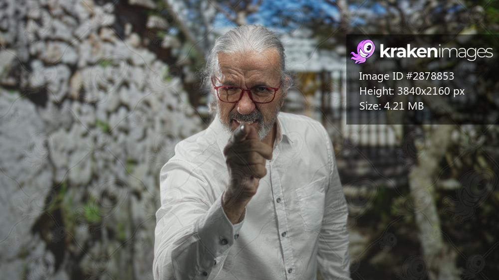 Man points finger at camera, hand extended toward viewer in front of building entrance; anger blame.
