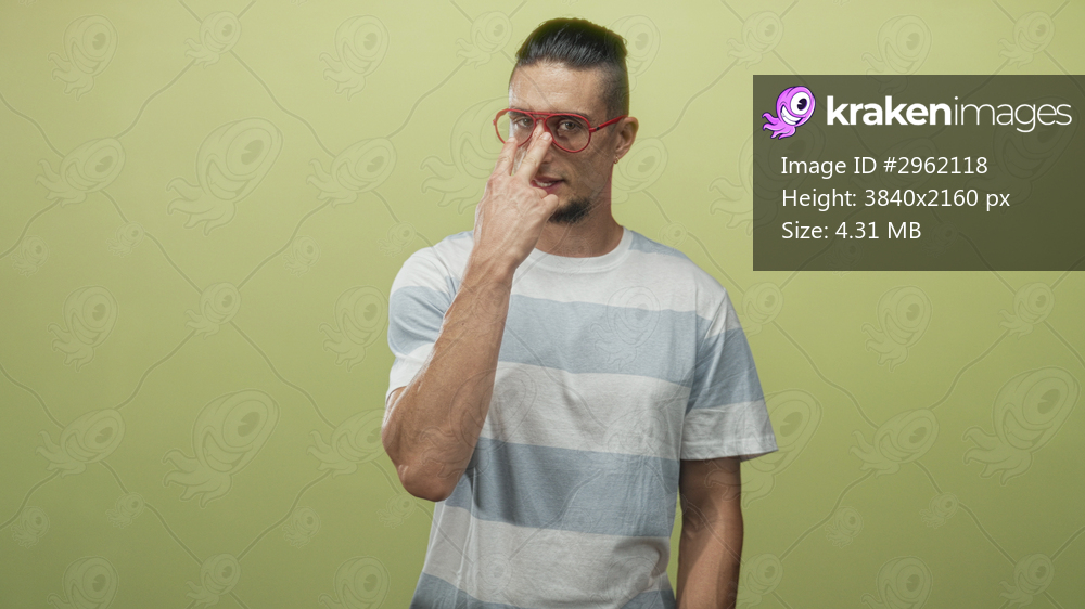 Man points finger at camera with hand extended, wearing red glasses and a striped t shirt in studio; playful confidence.