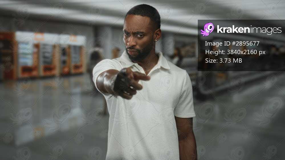 Man points finger at camera in airport terminal near moving walkway, white polo visible; confidence determination.