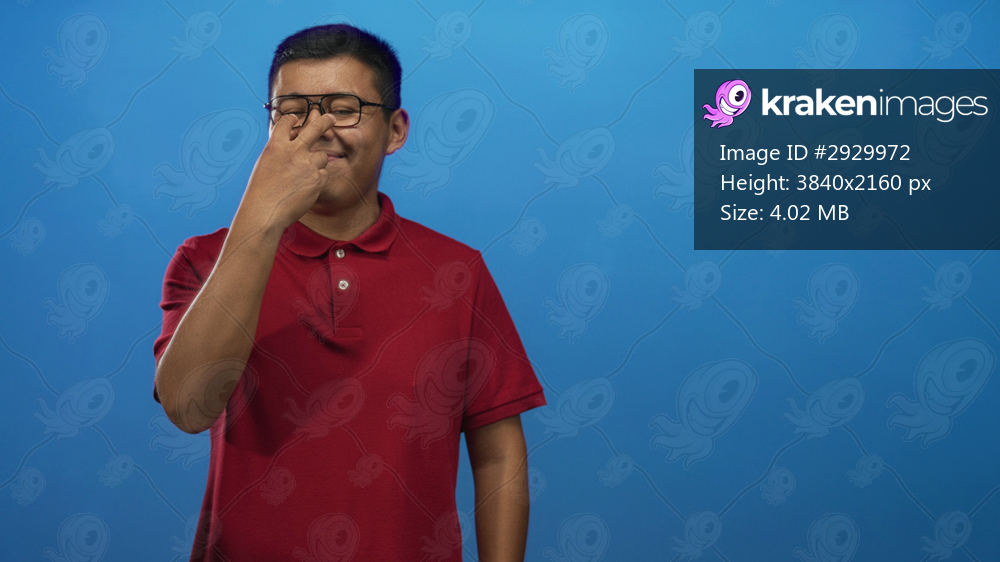 Man points finger at camera in blue studio wearing red polo shirt and glasses; confidence approachable.
