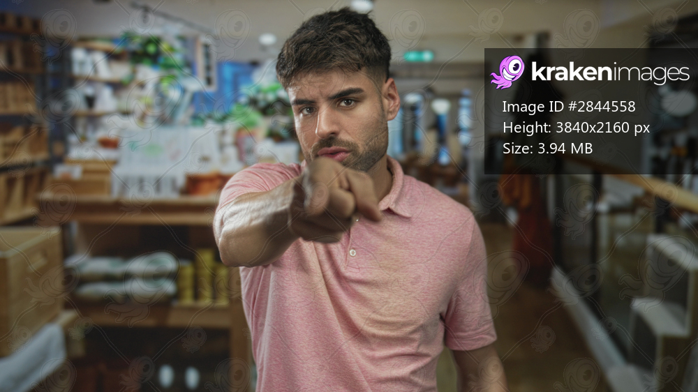 Man points finger at camera in home decor store building aisle with wooden shelves and decorative vases and plants; confidence.