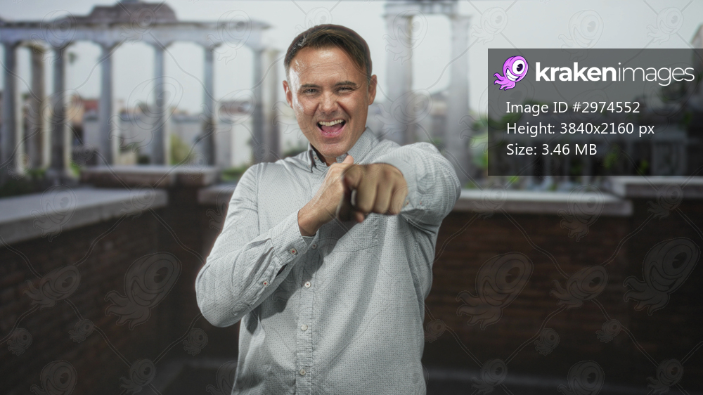 Man points finger at camera, laughs and alternately covers mouth while wearing a light patterned shirt on a building rooftop terrace with brick parapet and classical columns; playful confidence. - Kraken Images