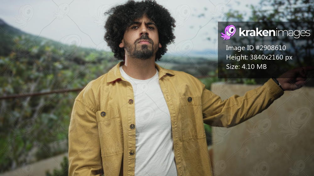 Man points finger at camera on building terrace outdoors, curly hair and beard, yellow jacket and white t shirt; accusation confrontation resolve.