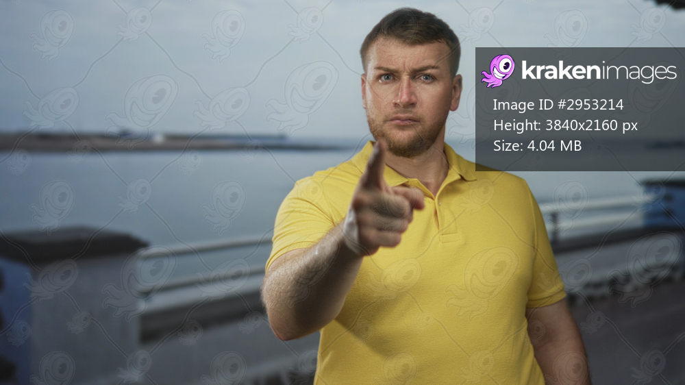 Man points finger at camera on seaside promenade in yellow polo with hands on hips; stern accusation.