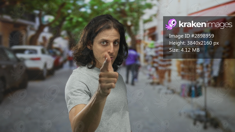 Man points finger at camera on street showing hand and face, long hair and gray t shirt; friendly invitation.