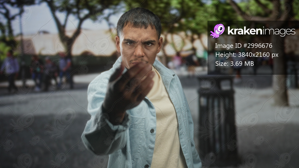 Man points finger at camera with outstretched hand beside a public trash can on a busy street, wearing light denim jacket and beige shirt; confrontation. - Kraken Images