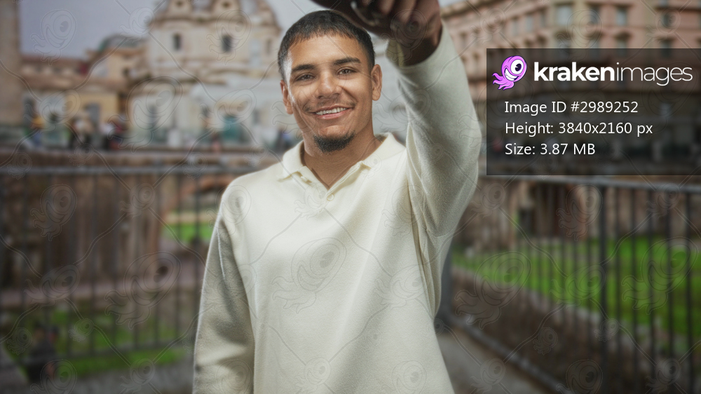 Man points finger at camera showing bare hand and smile in front of building; confidence friendly warm.