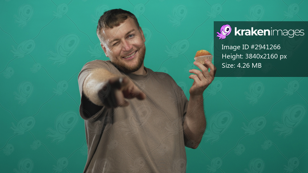Man points finger at camera while holding a muffin in green studio, smiling and winking and wearing a brown t shirt; playful invitation.
