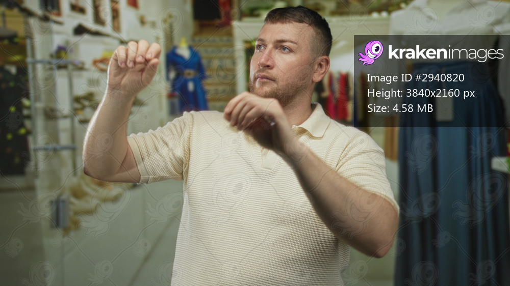 Man points finger at garment rack and raises hand showing forearm in building shop aisle, wearing beige polo and looking at display; curiosity.