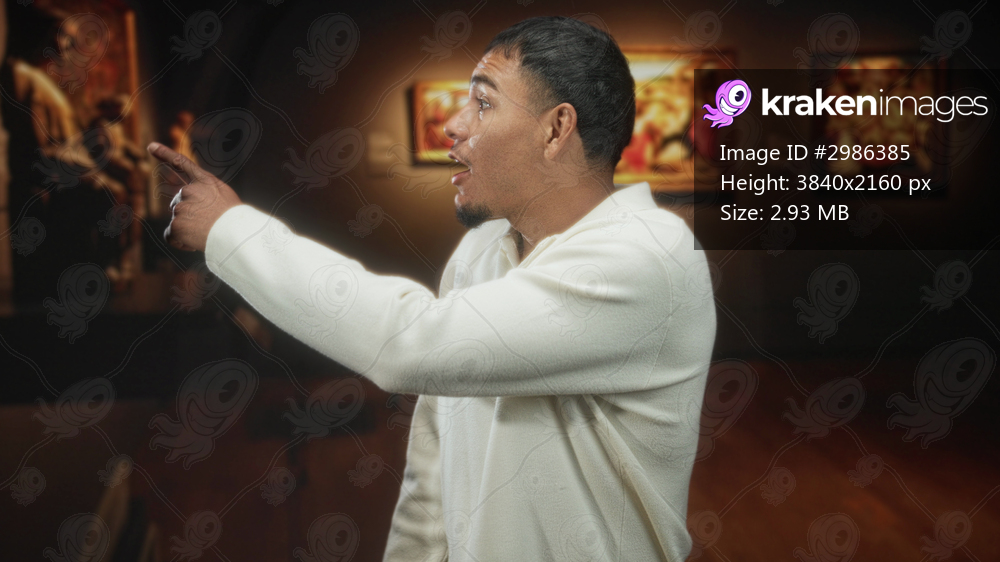 Man points finger at painting and open mouth while standing in a gallery building with spotlit artworks; joy.