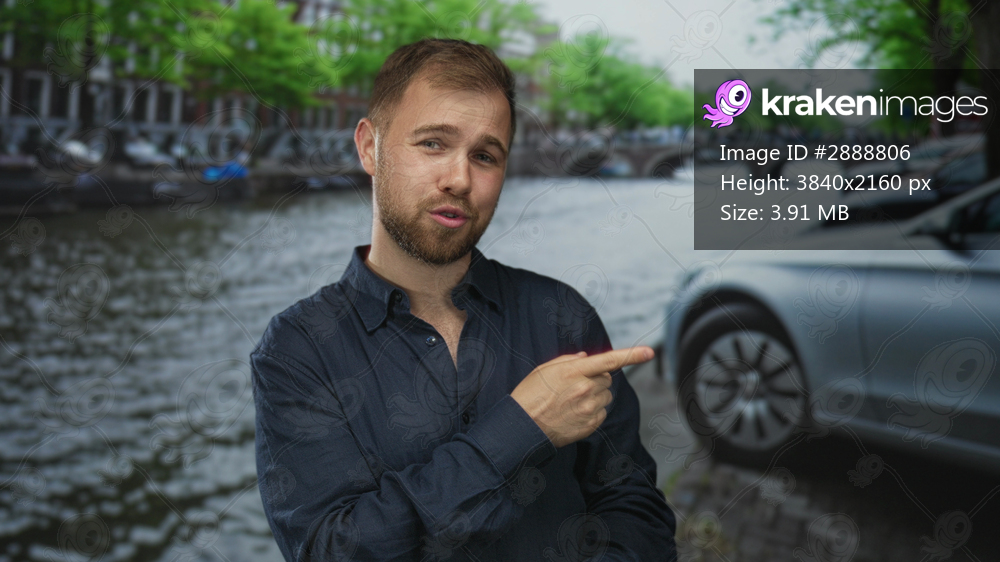 Man points finger at parked car on street in amsterdam canal area, visible pointing gesture and beard; curiosity travel.
