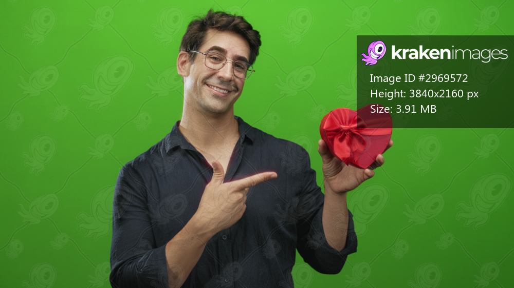 Man points finger at red heart gift box in studio while smiling, holding bow tied present and wearing glasses and dark shirt; romantic offering.