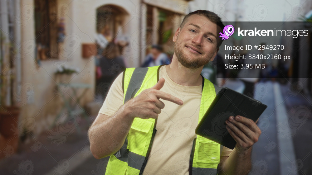 Man points finger at tablet on a busy street while holding the device and wearing a high visibility vest; confidence.