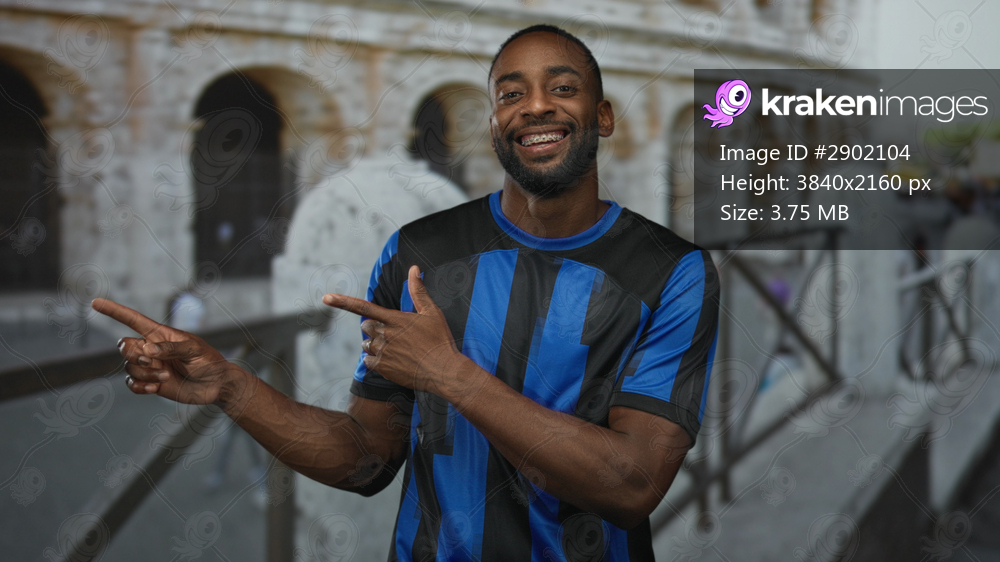 Man points finger with bare forearms wearing blue soccer jersey at roman colosseum building near ancient stone arches; team pride.