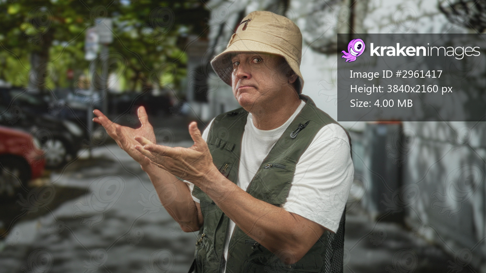 Man points finger with both hands on a street wearing fisherman vest and bucket hat; bemusement curiosity.