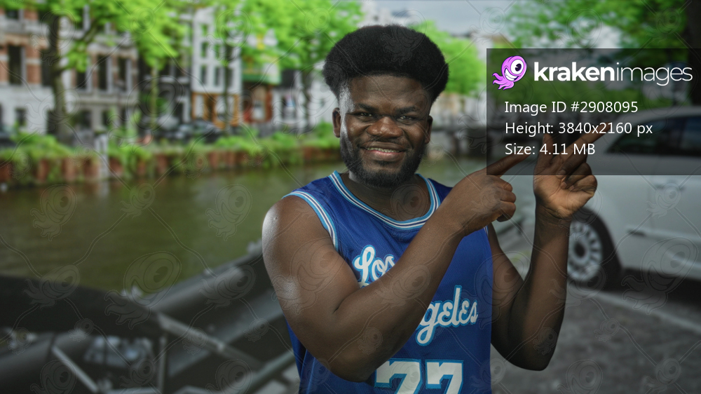 Man points finger with both hands on canal street in amsterdam showing bare forearm and broad smile; friendly travel joy.