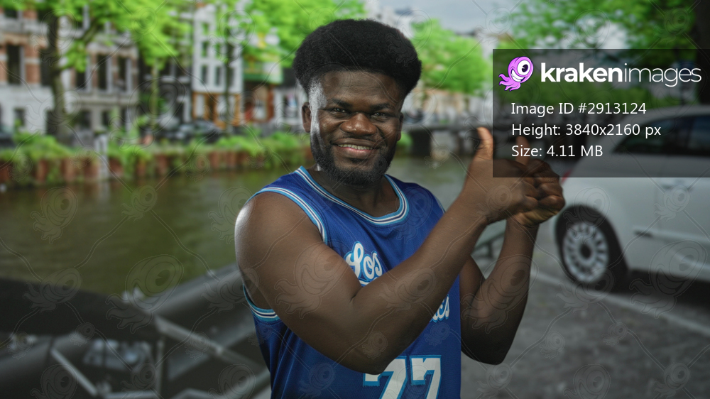 Man points finger with both hands on canal street in amsterdam showing bare forearm and broad smile; friendly travel joy.