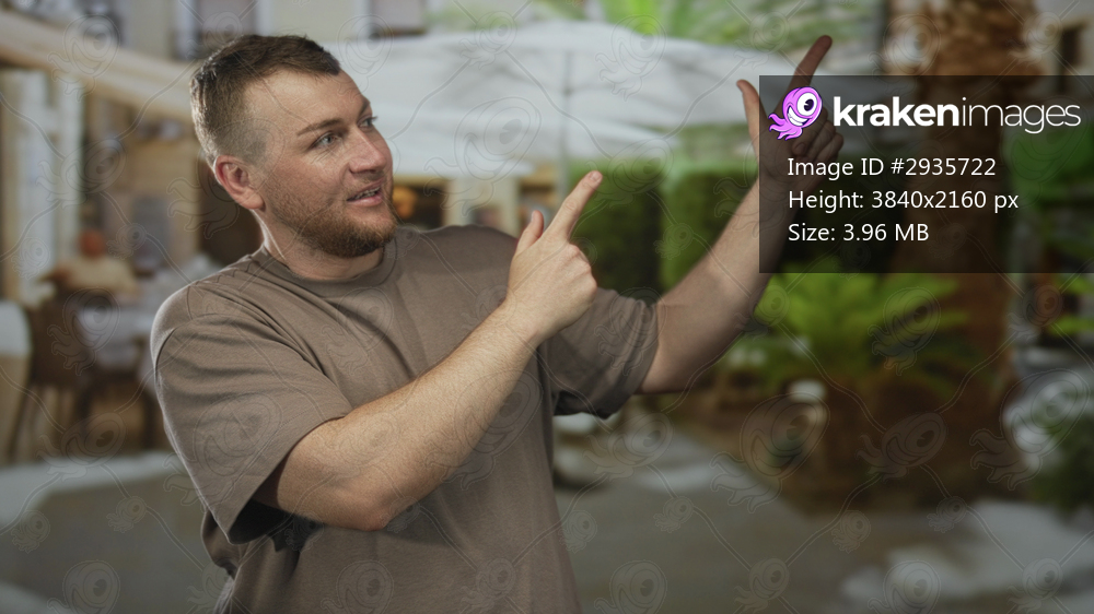 Man points finger with both hands toward terrace seating at outdoor restaurant, visible forearms and hands, smiling and looking sideways; playful invitation. - Kraken Images