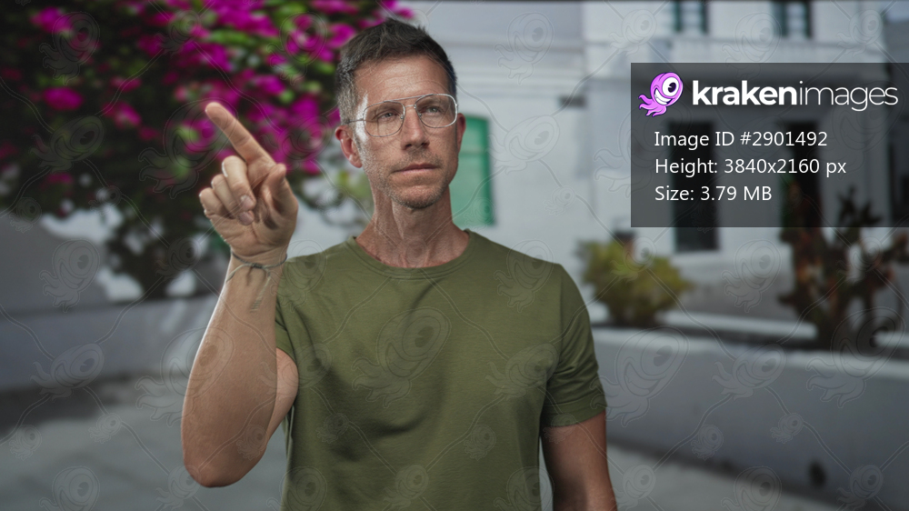 Man points finger directly toward camera in front of a white building and pink bougainvillea on a sunny street; thoughtful focus.