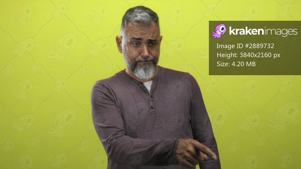 Man points finger forward with visible hand in studio against lime green wall; doubt hesitation decision.