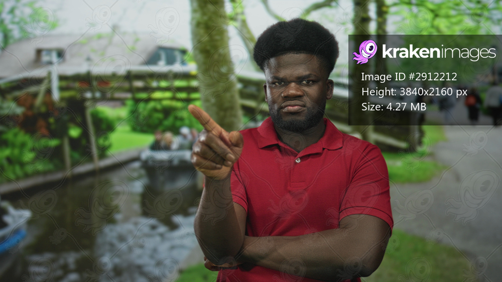 Man points finger, hand visible near canal and wooden bridge on street walkway in a park; firm determination.
