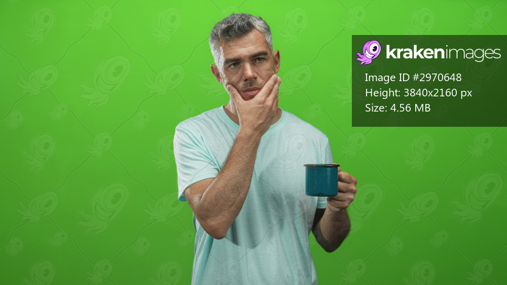 Man points finger and holds blue mug in studio against green screen, touching chin in some frames and smiling subtly; thoughtful reflection.