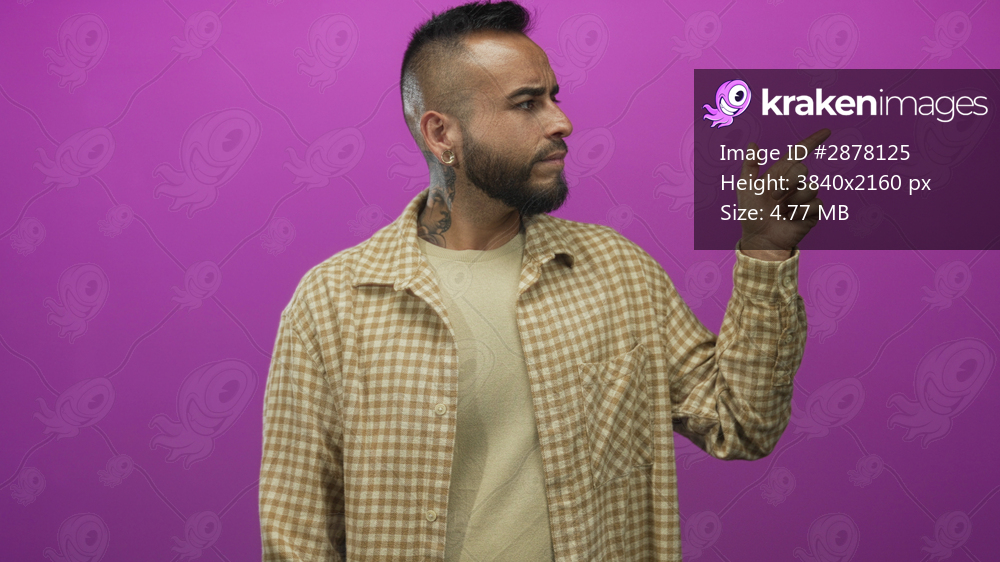 Man points finger in studio with purple backdrop and tattooed neck showing a side profile; doubt attention.