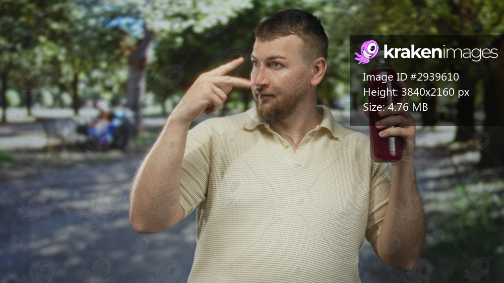 Man points finger with left hand and holds bottle of purple drink in right hand on forest path among green trees; confident offer.