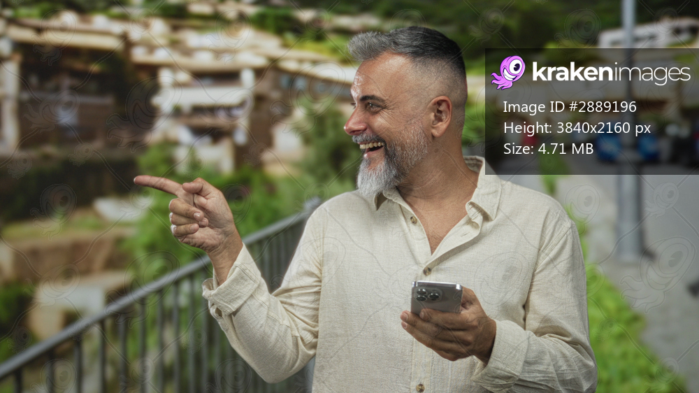 Man points finger with left hand while holding smartphone on a sunny street beside metal railing and parked cars, smiling; joy connection.