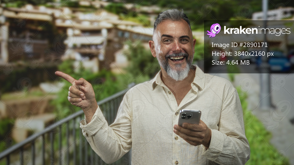 Man points finger with left hand while holding smartphone on a sunny street beside metal railing and parked cars, smiling; joy connection.