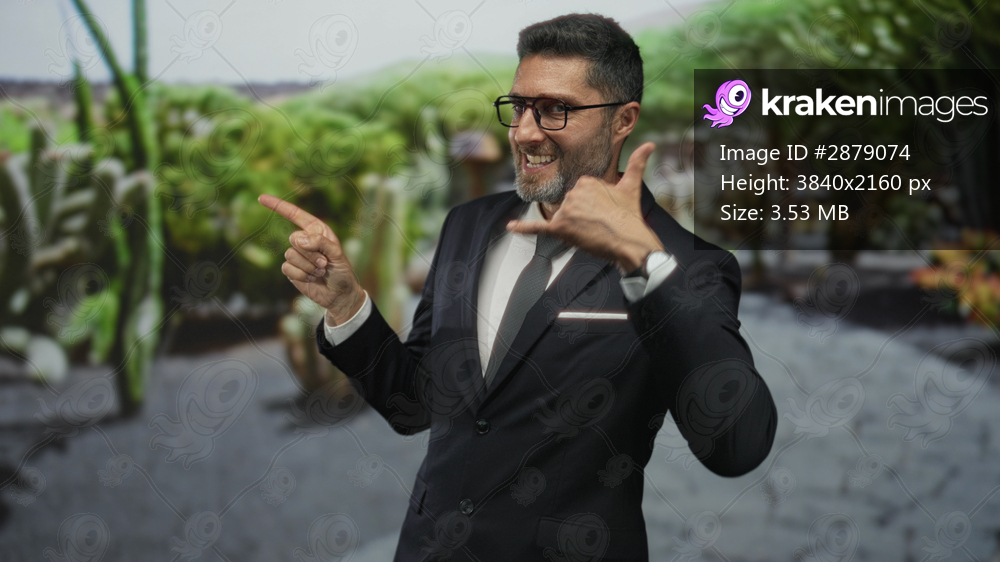 Man points finger and makes call gesture showing hand near ear on street in green park wearing suit and glasses; friendly confidence.