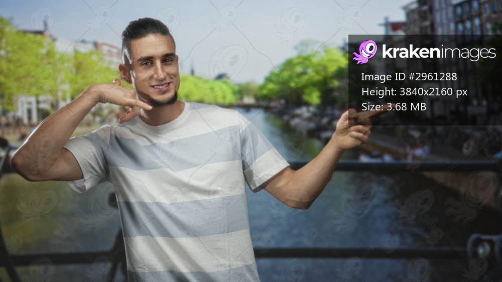 Man points finger on street bridge over canal beside bicycles wearing striped tshirt and earring while looking aside; friendly confidence.