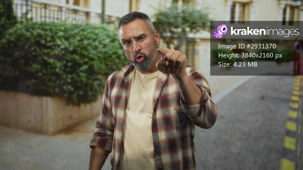 Man points finger on street in front of building with open hands and beard; frustration confrontation.