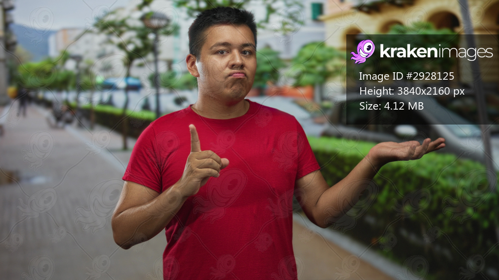 Man points finger with open palm on street in front of parked car and leafy hedge, wearing red t shirt and neutral expression; doubt.