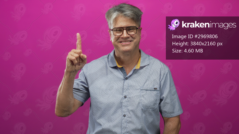 Man points finger with raised hand and smiles in studio against magenta backdrop wearing eyeglasses and shortsleeved shirt; friendly optimism.