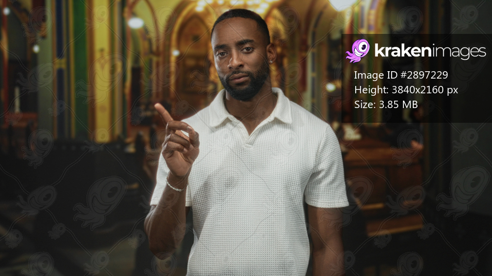 Man points finger with right hand near wooden pews and stained glass arch in church aisle while wearing white polo shirt; contemplation faith hope.