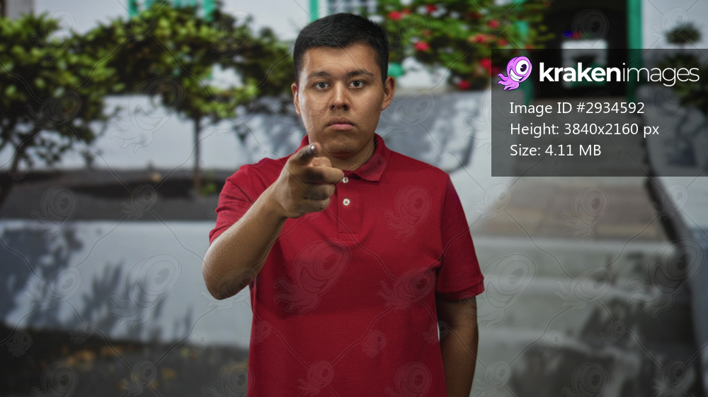 Man points finger to camera and finger to temple at building entrance, wearing red polo outdoors; thoughtful focus.