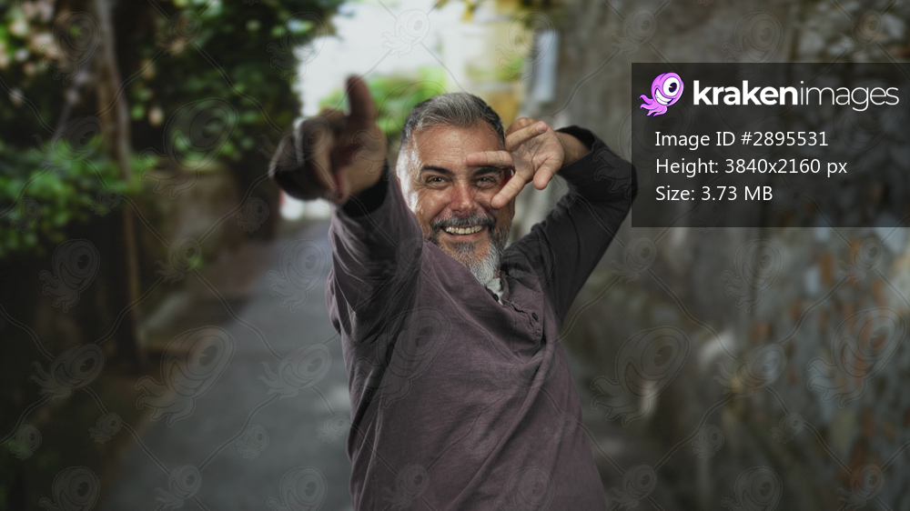 Man points finger to camera with hand framing eye at a house entrance on a street; playful confidence.