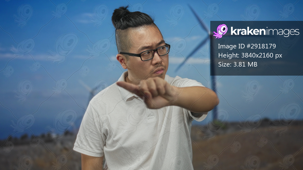 Man points finger to camera in field with windmill and white polo, glasses, stern expression; accusation anger.