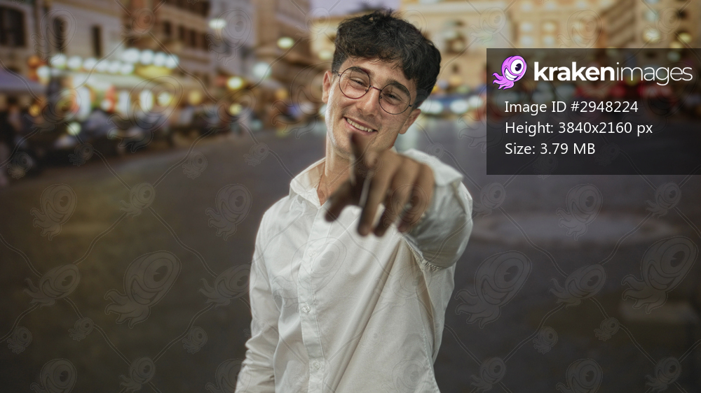 Man points finger to camera on city street at dusk, wearing white shirt and round glasses; friendly invitation.