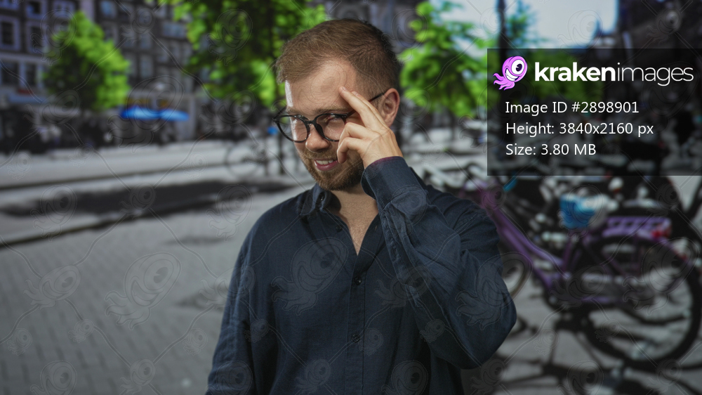 Man points finger to camera on city street wearing glasses and a navy shirt with a slight smile and bicycles behind; playful confidence.